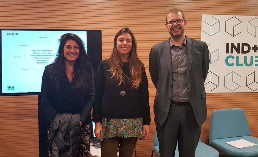 Nour Chams y Berta Vidal, ganadoras de los premios IND+I Science 2018, con Jordi G. Brustenga, secretario de la iniciativa IND+I