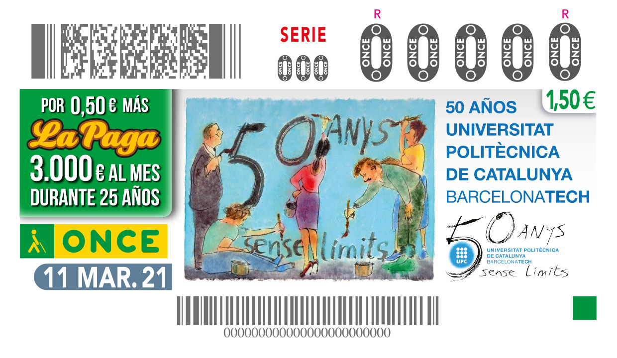 El próximo 11 de marzo, la Universitat Politècnica de Catalunya · BarcelonaTech (UPC) cumple, oficialmente, 50 años. Para conmemorar esta fecha, un total de 5,5 millones de cupones de la ONCE reproducirán el dibujo y el logo de Perico Pastor que ilustran las celebraciones del 50 aniversario de la UPC y que representan la nueva etapa de la Universidad, mirando el futuro sin límites.
