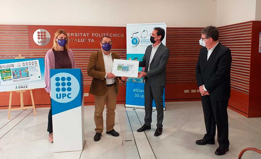 El cupón se ha presentado en un acto que ha tenido lugar el 3 de marzo y en el que Enric Botí, delegado territorial de la ONCE en Cataluña, y Manel Eiximeno, director del Centro de Recursos Educativos CRE ONCE Barcelona, han entregado a Francesc Torres, rector de la UPC, y a Gemma Fargas, vicerrectora de Responsabilidad Social e Igualdad, una imagen enmarcada del cupón conmemorativo del 50 aniversario de la Universidad.