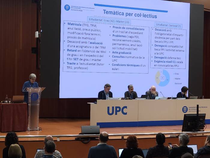 Por otra parte, Anna Serra Tort, ha presentado el informe de la Defensora Universitaria (Sindicatura de Greuges, en catalán) 2023 y ha recordado que la Universidad dispone de un canal interno de información que engloba los buzones de la Sindicatura de Greuges, de convivencia, de antifraude y de derechos lingüísticos.