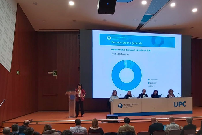 En la sesión del Claustro Universitario se ha presentado el Informe de actuaciones 2018 de la Síndica de Greuges, Neus Paris, en el que destaca el número y tipo de actuaciones tramitadas, su evolución en los últimos diez años, así como los resultados obtenidos.