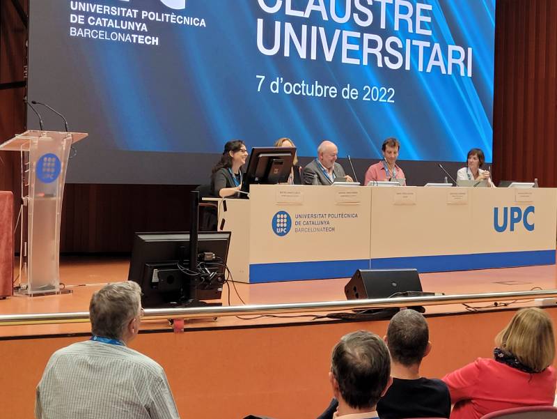 Las profesoras de la UPC Beatriz Amante y Adriana Farran, moderadoras de los turnos abiertos de intervenciones; el rector, Daniel Crespo, el vicerrector de Política Universitaria, Joan Gispets, y la secretaria general, Ana B. Cortinas, en la mesa de la sesión del 7 de octubre