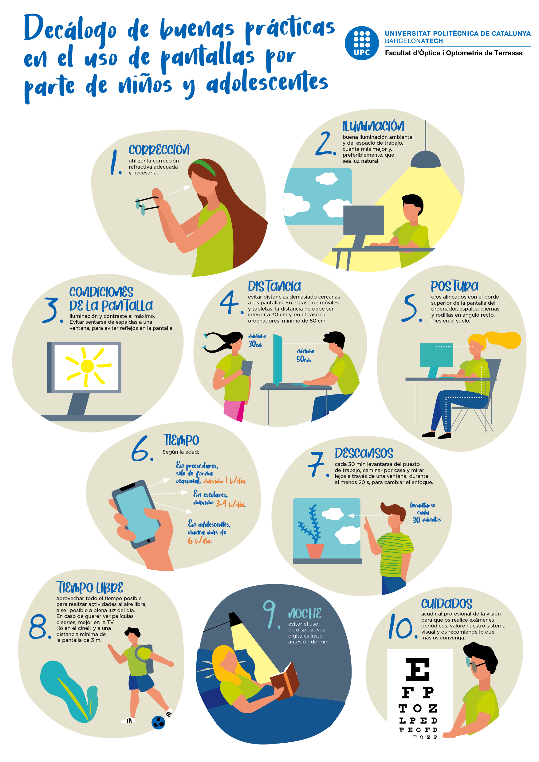 Con el objetivo de sensibilizar a la población sobre esta problemática y de ofrecer herramientas de prevención, la FOOT ha elaborado un decálogo con recomendaciones orientadas a hacer un buen uso de las pantallas y prevenir los problemas de salud visual, adecuar las condiciones en que se usan las pantallas y compensar la sobreexposición con actividades físicas o creativas que estimulan la comunicación y la socialización.