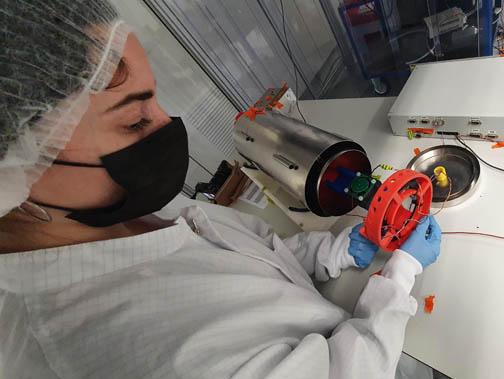 Una de las investigadoras del proyecto MELISA, trabajando en el desarrollo del prototipo de sensor magnético miniaturizado para reducir el ruido en misiones espaciales. Crédito: Equipo de MELISA (IEEC).