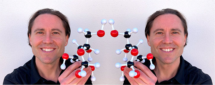 Montaje que ejemplifica la propiedad de la quiralidad, objeto de la investigación de Justin Zoppe, y que muestra al investigador sujetando un modelo de la glucosa, la unidad básica de la celulosa