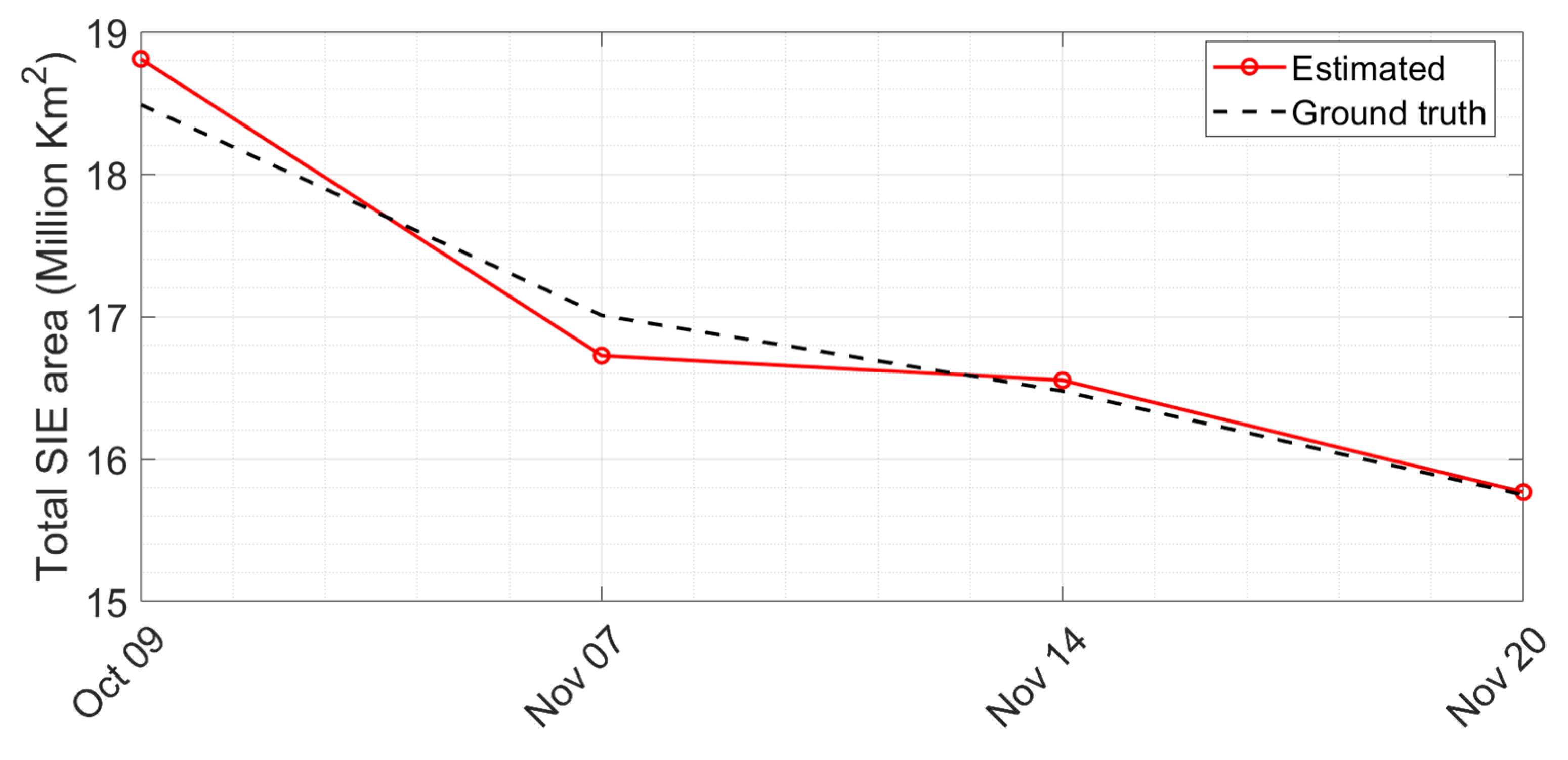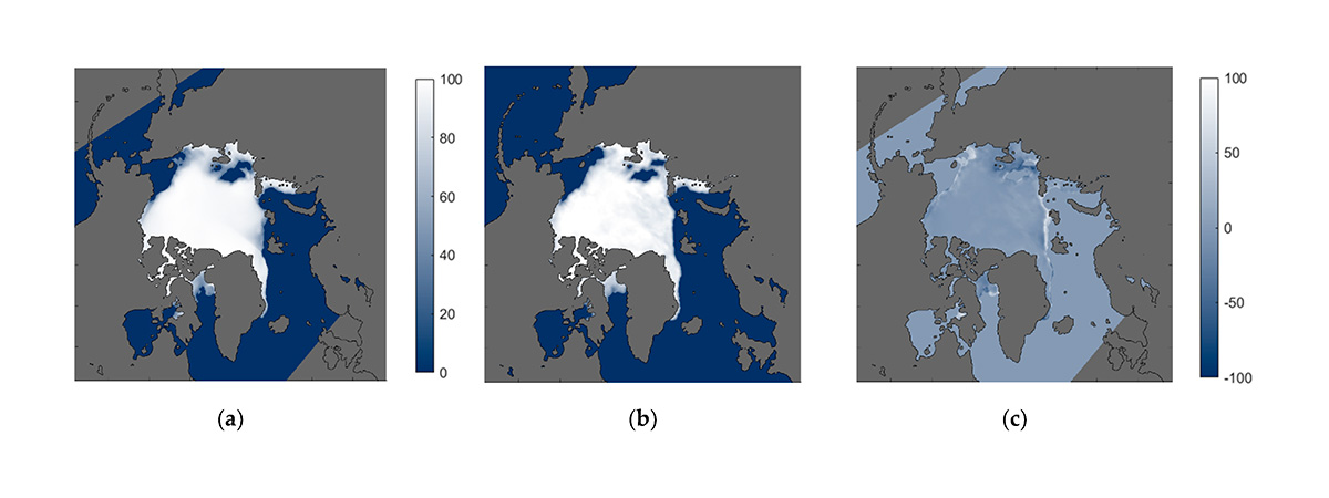 Mapas de concentración del hielo marino en el Ártico del 7 de noviembre de 2020: (a) mapa con datos del radiómetro de microondas del FMLP-2, (b) mapa verdad terreno (es decir, de medidas realizadas 'in situ') y (c) mapa de errores