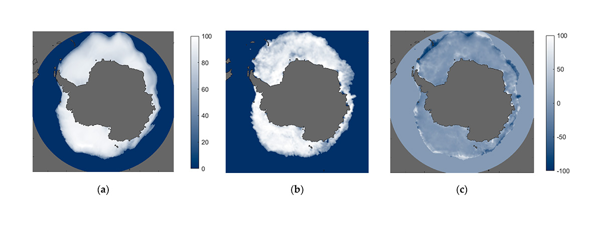 Mapas de concentración del hielo marino en el Antártico del 13 al 15 de noviembre: (a) mapa con datos del radiómetro de microondas del FMLP-2, (b) mapa verdad terreno (es decir, de medidas realizadas 'in situ')y (c) mapa de errores
