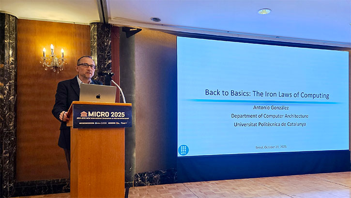 El profesor Antonio González, catedrático y doctor en Ingeniería Informática por la Universitat Politècnica de Catalunya - BarcelonaTech (UPC), profesor de la Facultad de Informática de Barcelona (FIB) e investigador de referencia internacional en el campo de la arquitectura de computadores, ha recibido, el 21 de octubre en Seúl (Corea del Sur) el premio B. Ramakrishna Rau 2025 por sus contribuciones al diseño de arquitecturas informáticas resilientes y energéticamente eficientes.
