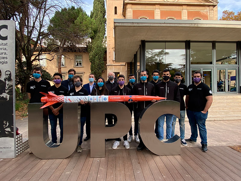 Una parte de los miembros de Cosmic Research, con una réplica del cohete Bondar. En segunda fila, Xavier Roca, director de la ESEIAAT-UPC; Dani Marco, director general de Innovación y Economía Digital de la Generalitat de Catalunya, y Daniel Crespo, rector de la UPC, durante la presentación del cohete