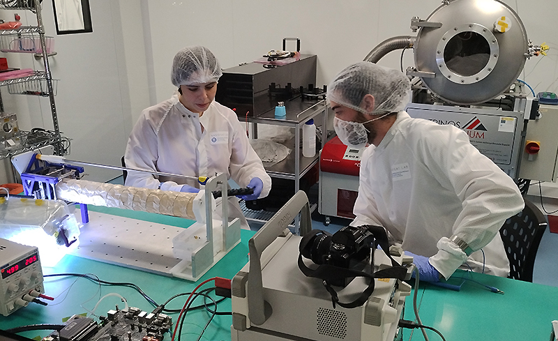 Lara Fernández, capitana de la misión, y Guillem Gràcia, ambos estudiantes de doctorado, haciendo observaciones del pequeño satélite, con la antena desplegada, en la sala limpia del NanoSat Lab, en Barcelona