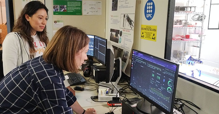 Nataly Buitrago y Kseniia Osipova, estudiantes del programa de doctorado en Ciencia y Tecnología Aeroespaciales implicadas en la misión, haciendo seguimiento remoto del estado del nanosatélite mediante un software de código abierto
