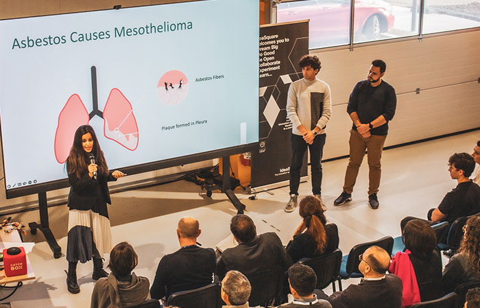 - Dispositivo disruptivo para diagnosticar mesotelioma. El equipo Manabe ha ideado un dispositivo de diagnóstico de mesotelioma –cáncer de pulmón inducido por inhalación de fibras de amianto– pensado para los trabajadores de desguace de barcos en Bangladesh, India. La solución combina el diagnóstico basado en el análisis hiperespectral del líquido pleural mediante una tecnología disruptiva de ATTRACT, con un programa de concienciación sobre la problemática entre los trabajadores.