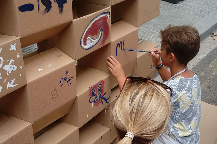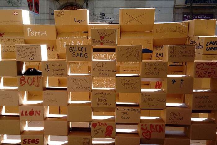 Su propuesta, denominada 'Pabellón de los deseos' y ubicada en plena calle Trafalgar, ha consistido en crear un muro que simulaba un tablero de ajedrez creado íntegramente con cajas de cartón recicladas y acopladas entre sí —sin hacer uso de pegamento—, en el que los ciudadanos han podido escribir con rotuladores y pinturas sus deseos para la Barcelona del futuro.