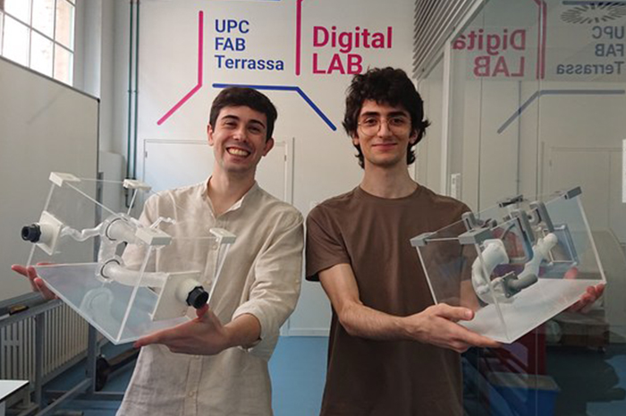 Los estudiantes de la Escuela Superior de Ingenierías Industrial, Aeroespacial y Audiovisual de Terrassa (ESEIAAT) de la UPC Sergio Correas y Adrià Portero, dirigidos por el profesor Tomeu Ventayol, han diseñado y creado dos simuladores de la arteria aorta y las arterias coronarias con tecnología de fabricación aditiva, para que el personal médico del hospital de la Santa Creu i Sant Pau puedan practicar el cateterismo cardíaco y la exploración visual escópica.