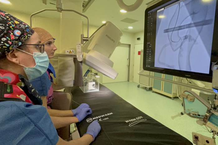 De hecho, Correas y Portero han trabajado in situ en los quirófanos con los médicos y las médicas del área de Hemodinámica del Hospital de la Santa Creu i Sant Pau, donde los propios residentes y cardiólogos han realizado dos jornadas de interacción, practicando con los biomodelos la técnica del cateterismo cardíaco y la observación con exploración visual escópica. Antes, los dos estudiantes de la UPC en Terrassa participaron en sesiones preliminares para comprender el conjunto anatómico de los pacientes y situar la correcta orientación del modelo. Todo ello con la colaboración del cardiólogo Abdel Hakim Moustafa, especialista en Imagen Cardíaca del Hospital de la Santa Cruz y San Pablo.
