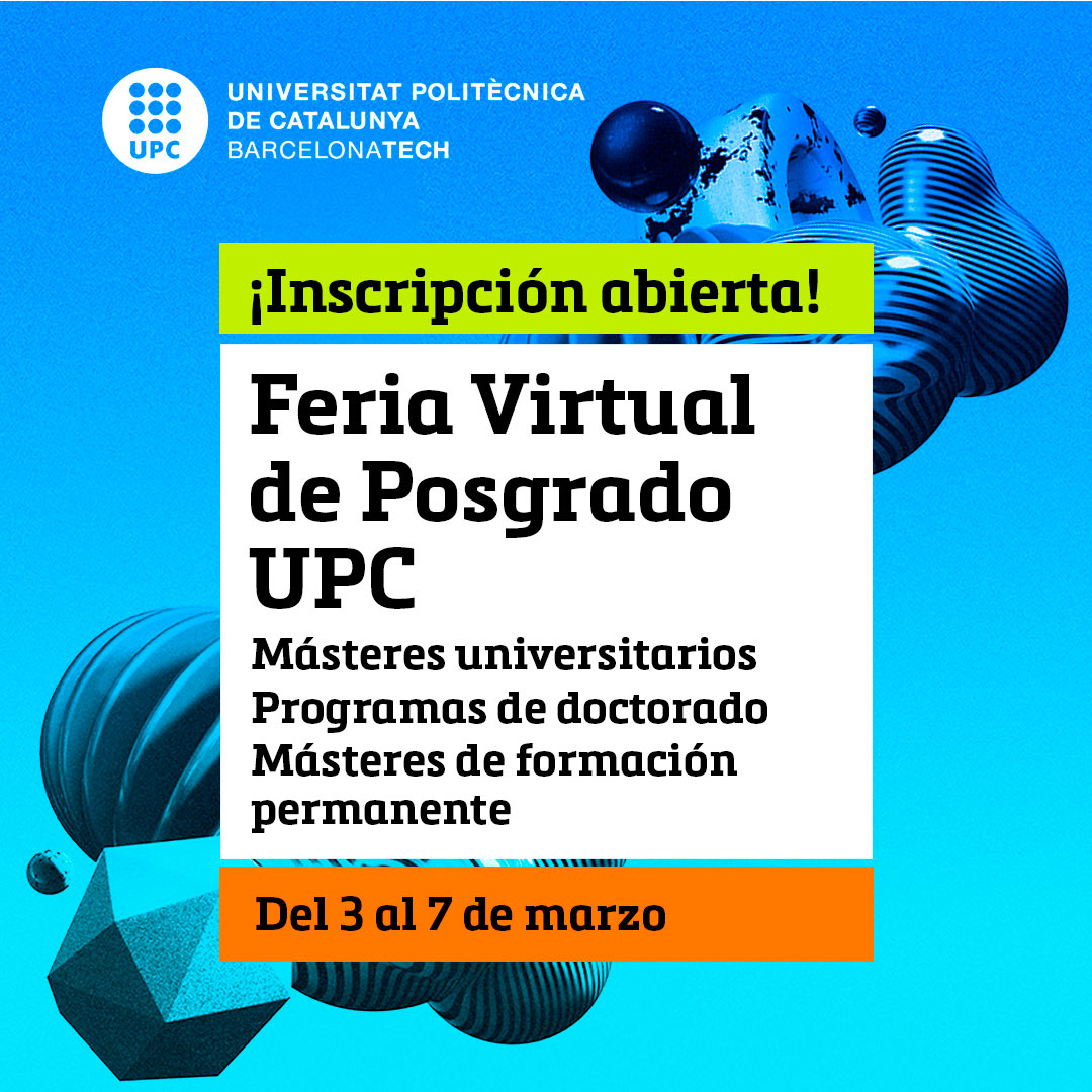 La Feria Virtual de Posgrado de la Universitat Politècnica de Catalunya - BarcelonaTech (UPC) tiene lugar del 3 al 7 de marzo con un amplio programa de sesiones informativas en formato on line sobre la oferta de másteres universitarios, programas de doctorado y másteres de formación permanente en los ámbitos de la ingeniería, la arquitectura, las ciencias y la tecnología. A través de sesiones informativas en directo, el profesorado de los diferentes estudios explica el contenido académico de los programas, el plan de estudios, las salidas profesionales y resuelve posibles dudas.