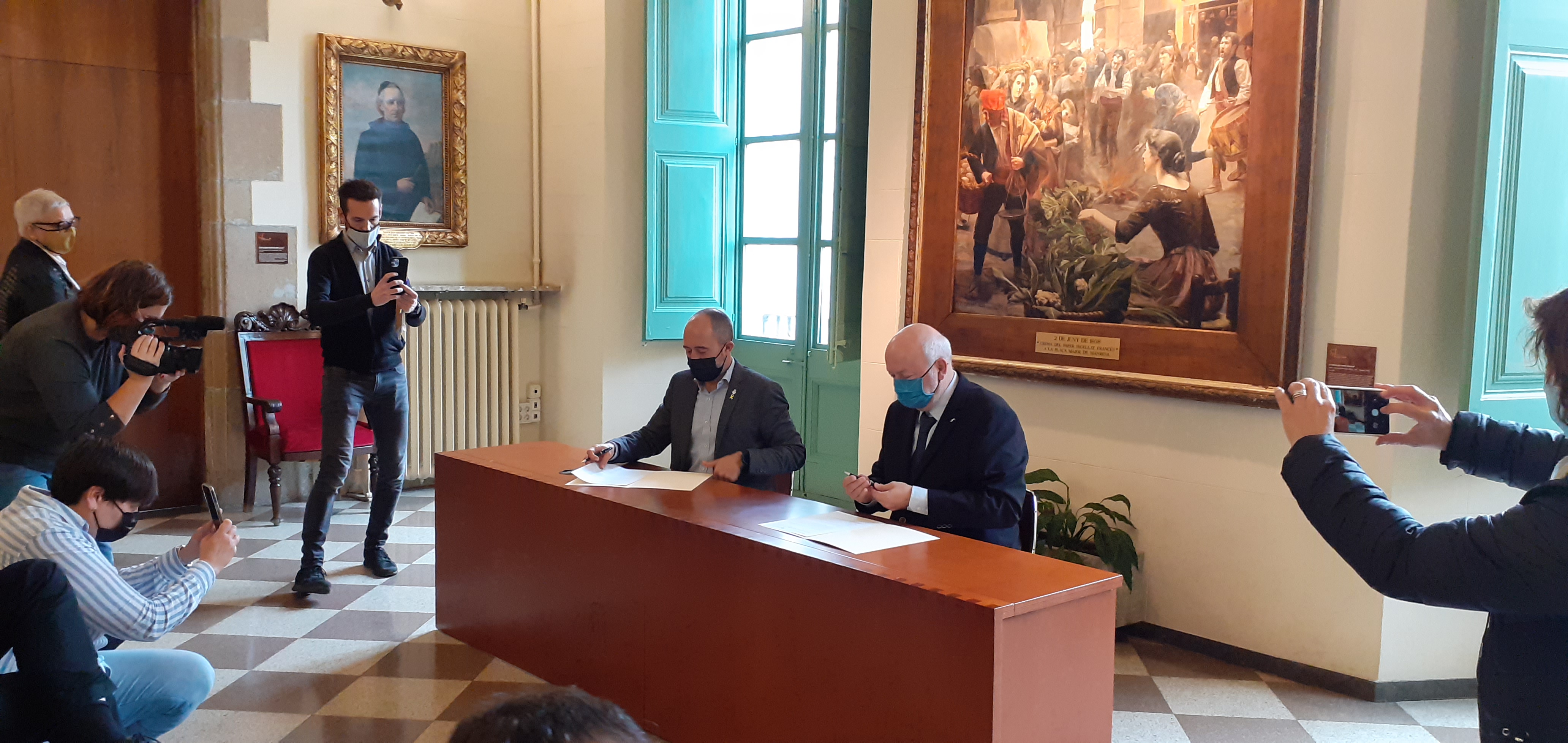 A mediodía, el rector de la UPC y el alcalde de Manresa firmaron un protocolo entre ambas instituciones para la creación del polo de formación y conocimiento. El Ayuntamiento y la UPC han acordado establecer un marco de colaboración para el impulso del proyecto, que pretende convertirse en un centro de referencia en el ámbito de las nuevas tecnologías. Ambas instituciones manifiestan también su compromiso de trabajar firmemente para tejer las complicidades necesarias y conseguir los recursos que permitan desarrollar el proyecto, así como priorizarlo en las solicitudes en el marco del programa Next Generation, y también buscando la complicidad de otros agentes y administraciones. Posteriormente, por la tarde, se hizo la presentación pública del proyecto, en el auditorio de la Plana del Olmo de Manresa.