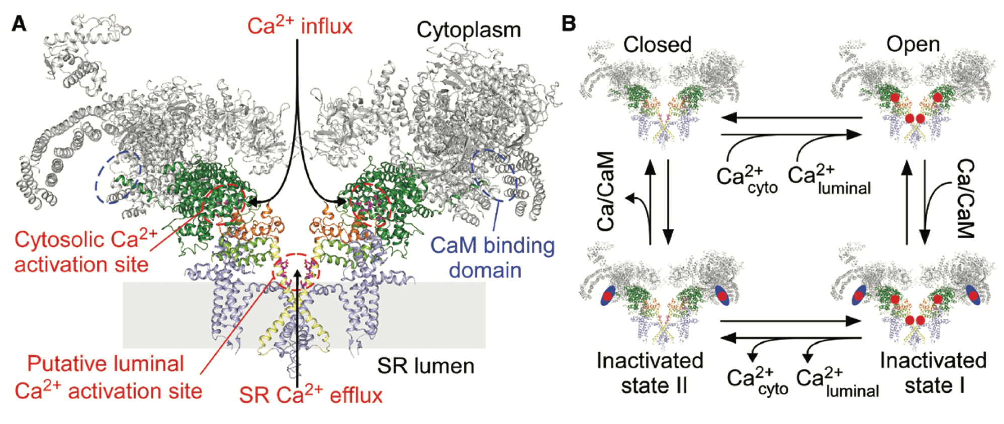 Estructura tridimensional de un receptor de rianodina (RyR), la proteína que regula la liberación de calcio en la célula. Entre los factores que regulan su función está la calmodulina (CaM). Utilizando un modelo computacional del funcionamiento del RyR (B), que tiene en cuanta su interacción con la CaM, se ha mostrado que es un factor esencial para entender la aparición de los alternans cardíacos.
