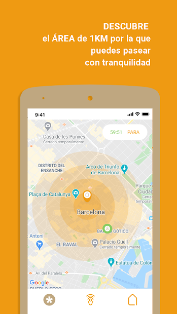 La app 'SafeWalkNearby' indica el área de un kilómetro en la que están permitidos los paseos con menores de 14 años respecto al domicilio y monitoriza en todo momento la distancia en la que se encuentra el usuario en un mapa interactivo. Además, la aplicación permite registrar el tiempo que duran los paseos, envía avisos y notificaciones para indicar que se ha superado el tiempo o la distancia máxima recorrida, y también indica cuando hay que empezar el camino de vuelta a casa.