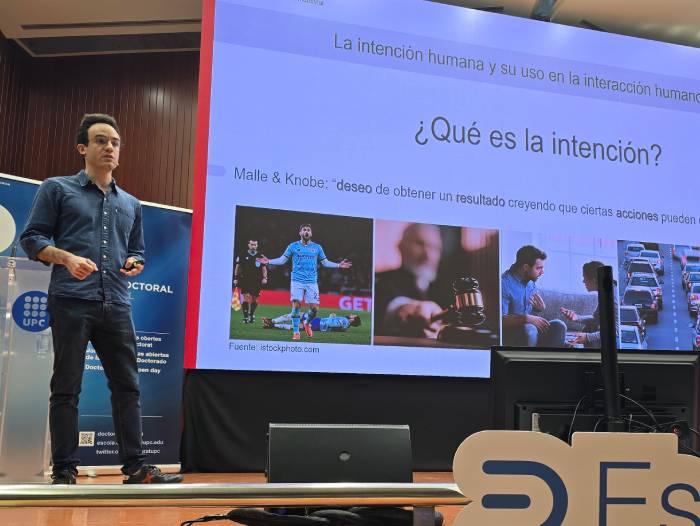 José Enrique Domínguez, representante de la UPC en la final de ‘Presenta tu tesis en 4 minutos’, durante la presentación de su proyecto ‘La intención humana y su uso en la interacción humano-robot’ en la final de la UPC