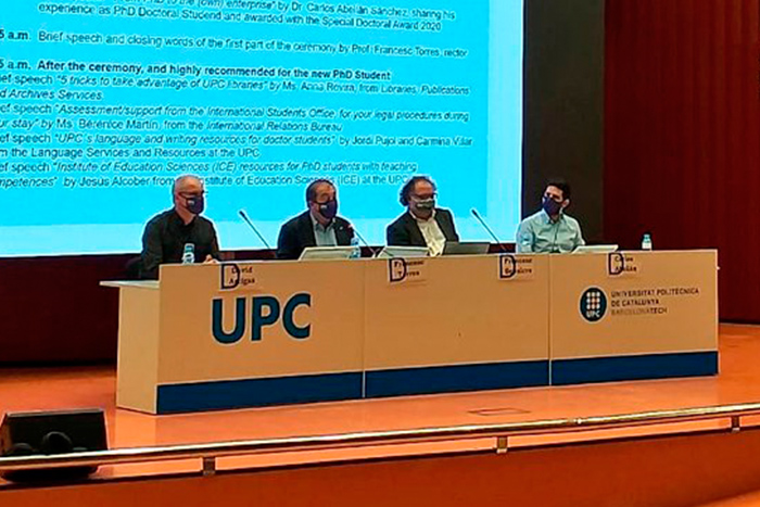 Después de la presentación del premio, Anna Rovira, del Servicio de Bibliotecas, ha informado sobre cómo sacar provecho de las bibliotecas de la UPC. Así mismo, Bérénice Martín, del Gabinete de Relaciones Internacionales, ha explicado cómo recibir asesoramiento y apoyo respecto a los trámites legales. Jordi Pujol y Carmina Villar, del Servicio de Lenguas y Terminología , han dado a conocer recursos lingüísticos para los estudiantes de doctorado. I, finalmente, Jesús Alcober, del Instituto de Ciencias de la Educación, ha informado sobre los recursos para los doctorandos y doctorandas con vinculación de PDI.