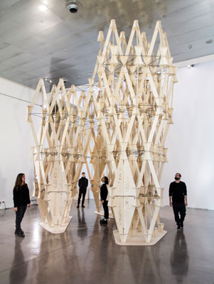 La escultura 'La construcción de valores', diseñada y construida en madera por estudiantes de la ETSAB, da la bienvenida a la exposición y simboliza los valores que construye el estudiante de arquitectura y que mantiene el arquitecto. Habla de valores personales, académicos y profesionales, pero también habla de los valores cuantificables que permiten su diseño, fabricación y construcción arquitectónica. Habla de los arquitectos y habla de la arquitectura.
