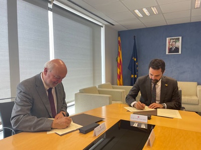 El consejero de Empresa y Trabajo de la Generalitat de Catalunya, Roger Torrent, y el rector de la UPC, Daniel Crespo, han firmado el contrato de adjudicación para la gestión del Centro de Formación Profesional de Automoción (CFPA), que se convertirá en un Campus de gran alcance con formación profesional inicial, ocupacional y continuada en torno al sector de la automoción y la movilidad más avanzada.