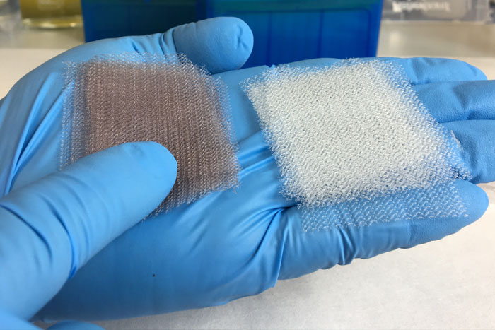 Foto de las mallas quirúrgicas. Las mallas de color rojizo cobre (izquierda) están recubiertas de nanopartículas de oro. Las mallas blancas de la derecha son las originales antes del tratamiento de nanopartículas