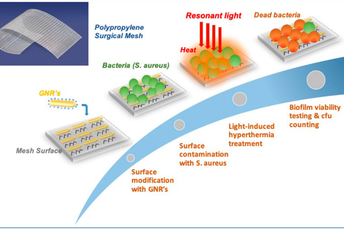 A través de una colaboración que se inició en 2012, el equipo de investigadores del ICFO y B. Braun Surgical, S.A. ha desarrollado una malla quirúrgica una característica particular: la superficie de la malla está modificada químicamente para anclar millones de nanopartículas de oro. ¿Por qué? Pues porque se ha demostrado que las nanopartículas de oro convierten de manera muy eficiente la luz en calor en regiones muy localizadas, de alcance nanométrico, siendo este efecto útil para destruir la membrana celular de las bacterias y deshacer el entramado protector del biofilm constituido por moléculas denominadas proteoglicanos.