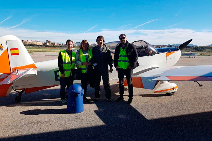 El equipo de investigación de Dexeus Mujer y la UPC, delante de la avioneta especializada en la ejecución de vuelos acrobáticos con la que se ha realizado el ensayo