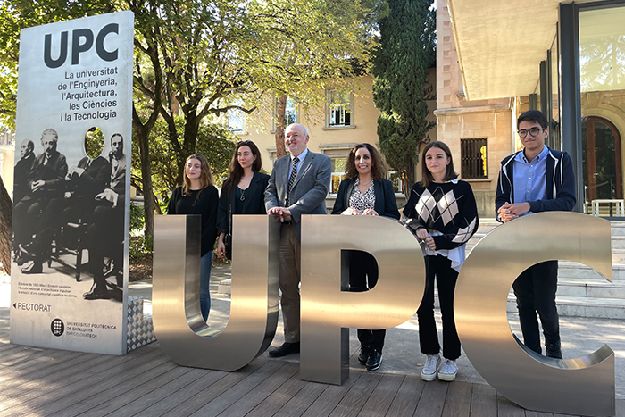 El rector de la UPC, Daniel Crespo, y la vicerrectora de Docencia y Estudiantado, Fatiha Nejjari Akhi-elarab, en el centro de la imagen, con las ganadoras y el ganador de los premios