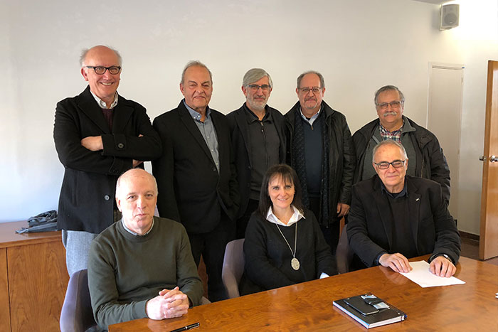 En la imagen, de izquierda a derecha, en primer término, el director de la ETSAB, Félix Solaguren-Beascoa; la directora de la ETSEIB, Neus Cónsul; y el vicerrector de Infraestructuras y Arquitectura, Estanislau Roca. En la fila de atrás, Fernando Álvarez, del Departamento de Historia del Arte y de Arquitectura de la UPC; Eusebi Casanelles, vicepresidente del Patronato del Museo de la Colonia Vidal; Joaquim Sabaté, del Departamento de Urbanismo y Ordenación del Territorio de la UPC; Alex Sánchez, director del Departamento de Historia Económica de la UB; y Antoni Roca, del Departamento de Matemáticas de la UPC.