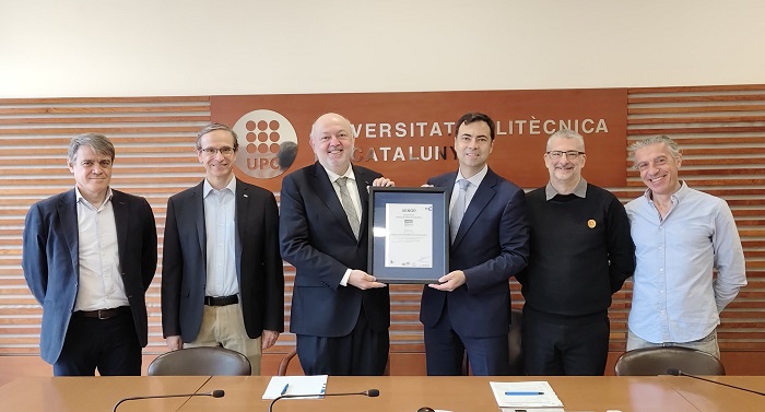 El rector de la UPC, Daniel Crespo, acompañado del vicerrector de Transferencia, Innovación y Emprendimiento, Climent Molins, recibió, el 28 de marzo, la certificación de manos de Jordi Martin, director de AENOR en Cataluña, la entidad responsable de la evaluación, calificación y otorgamiento de la certificación.