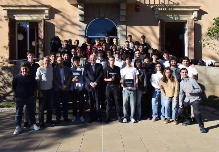 Estudiantes de las asociaciones galardonadas AIChe Student Chapter, Castelldefesta y Catalonian Innovation & Maker Association (CIMA3D), en la entrega de los premios