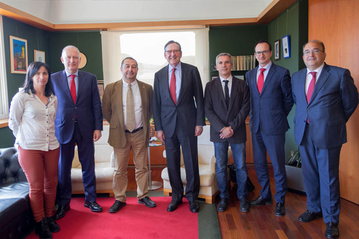 De izquierda a derecha: Carme Fenoll, jefa de Gabinete del Rectorado de la UPC; Luis Herrero, director territorial institucional en Catalunya del Santander; Francesc Torres, rector de la UPC; Matías Rodriguez Inciarte, presidente de Santander Universidades; Xavier Massó, gerente de la UPC; José María García de los Ríos, director de Convenios y Mecenazgo del Santander; José María Martínez, director de las Institucions en Catalunya del Santander.