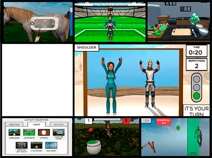 Imagen superior: algunas de las pantallas que se motan en la aplicación computacional desarrollada por los investigadores del LAM de la UPC, utilizando la realidad virtual no inmersiva para la rehabilitación motriz y cognitiva de personas con diversidad funcional, principalmente pacientes que han sufrido un ictus