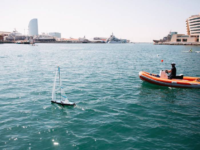 El equipo eTech Sailing de la EEBE con su velero radiocontrol. Imagen: Thomas Williams / Barcelona Capital Nàutica