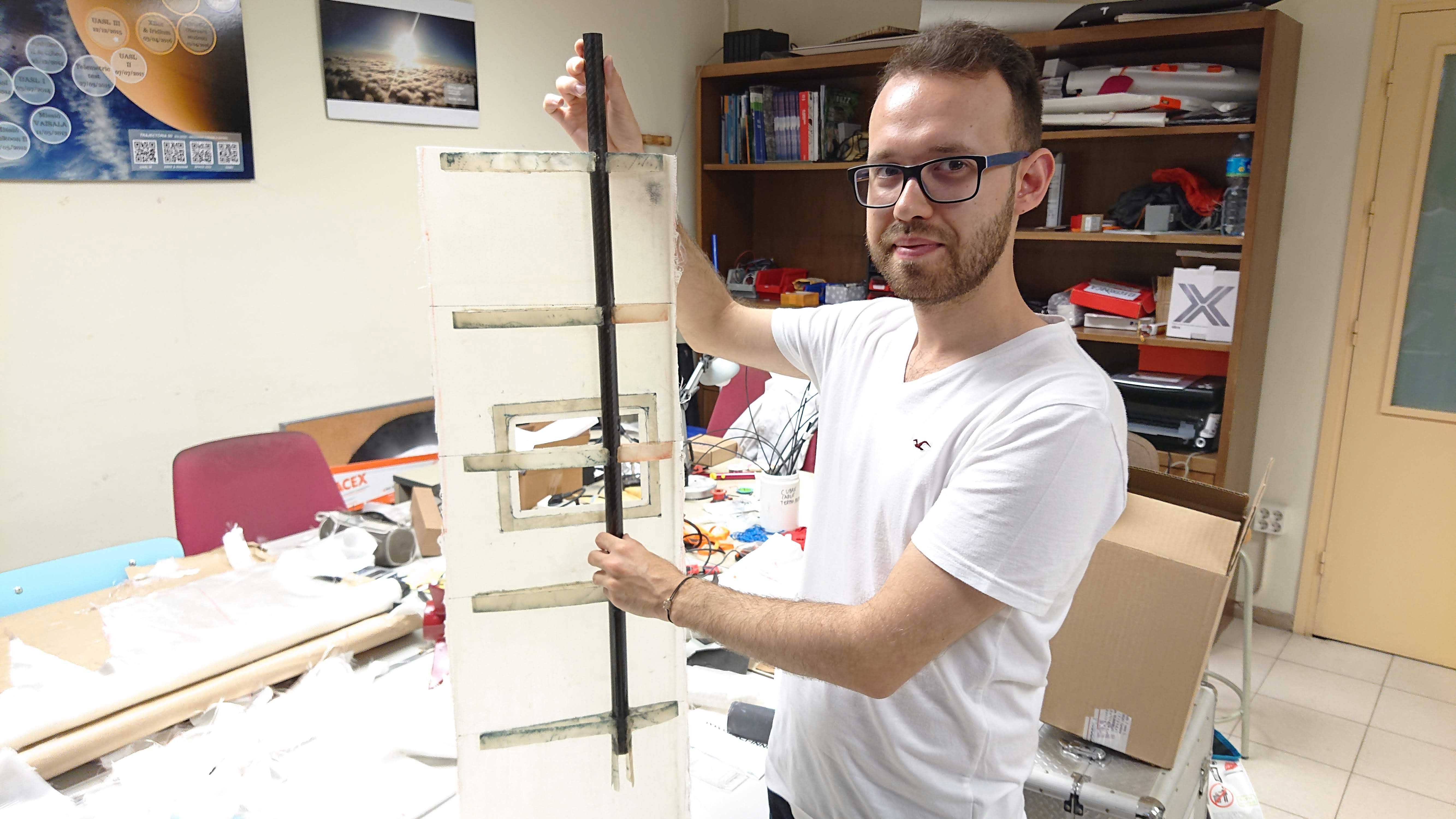 Pero también es importante su ubicación dentro de la aeronave para evitar que su distribución requiera una estructura voluminosa que genere una elevada fricción con el aire. Por ello, Lumbierres ha pensado en un encapsulamiento de baterías de pequeño formato. Cuanto mayor es la batería, más necesario es un fuselaje de mayores dimensiones, que resulta menos eficiente. Si el encapsulado individual de las celdas que conforman la batería es menor, estas se pueden distribuir por la aeronave sin aumentar las dimensiones del fuselaje. Así, el estudiante ha encontrado una solución ingeniosa para ubicar las baterías: encajarlas dentro de un tubo cilíndrico que, a la vez, haría la función de viga transversal de las alas. De esta manera se mantiene un diseño del fuselaje aerodinámico, esbelto, minimizando así la fricción con el aire.
