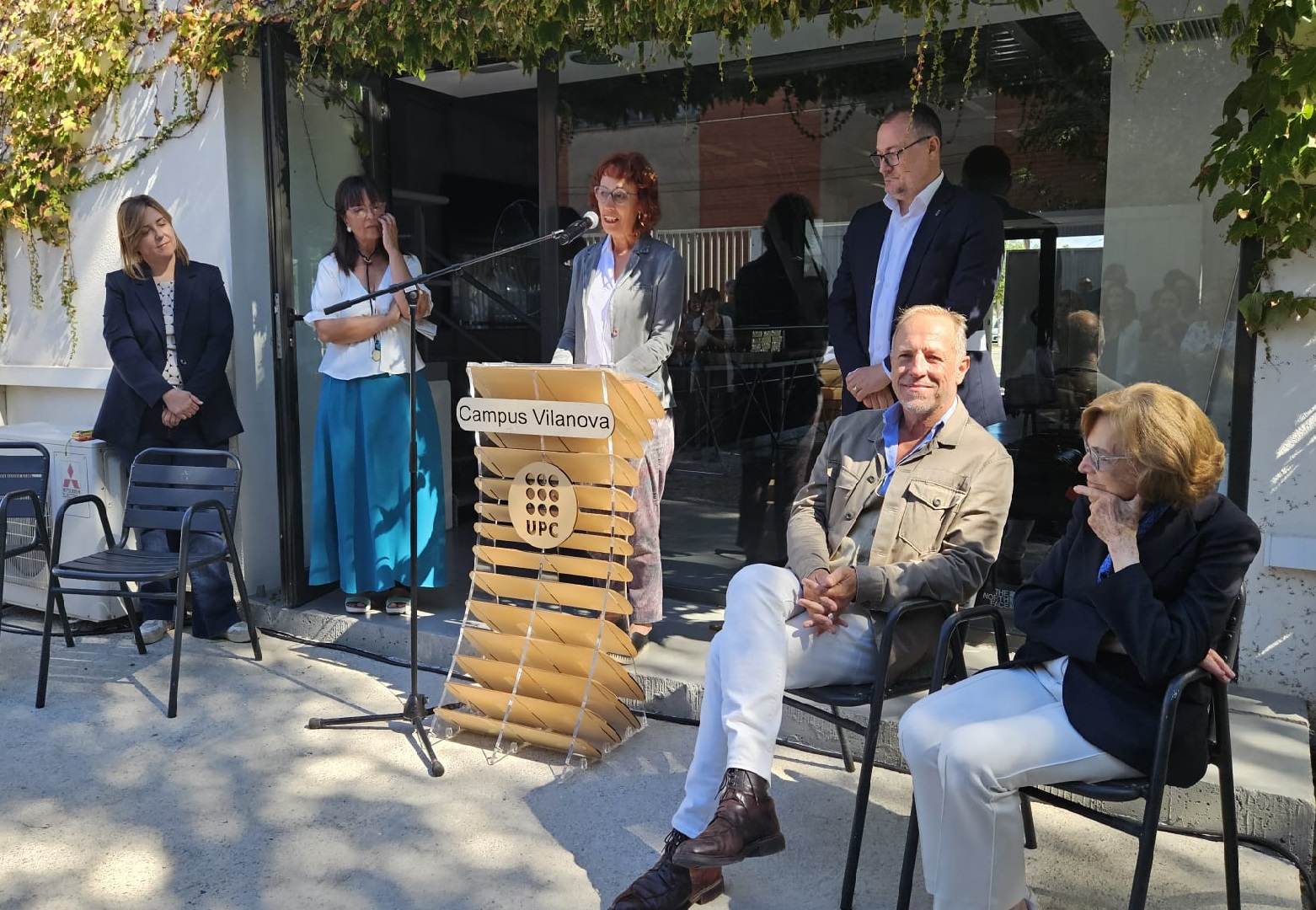 De izquierda a derecha, la directora de la Zona Portuaria Centro de Ports de la Generalitat, Esther Blanco; la vicerectora Josefina Antonijuan; la directora de la EPSEVG, Marisa Zaragozá; el alcalde de Vilanova i la Geltrú, Juan Luis Ruíz; el director del LAB, Michel André, i la oceanógrafa Sylvia A. Earle, durante el acto