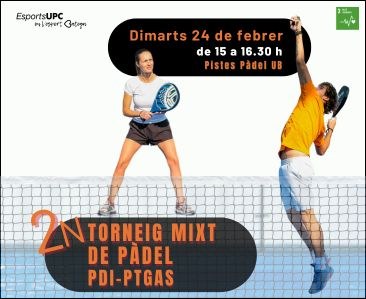 Abona-t'hi Subscriu-te al Butlletí Crèdits Competicions Competicions ActivitatsActivitats Instal·lacions Instal·lacions Campus Campus Salut Salut PDI-PTGAS Notícies Titulacions Nàutiques 12/01/2026 Pauses actives saludables 12/01/2026 2n Torneig de Pàdel Mixt PDI-PTGAS de la UPC 12/01/2026 Comença l'any fent esport, salut..., i crèdits! 12/01/2026 Campionats de Catalunya Universitaris 12/01/2026 Esgrima 12/01/2026 Previous Next Esports UPC en dades 4913Promoció i salut 2085Competicions internes 1210Campionats de Catalunya 188Tutoresport-UPC 1499 Unirun 492Programa PDI-PTGAS Memòries d'activitats Serveis online Associacions UPC