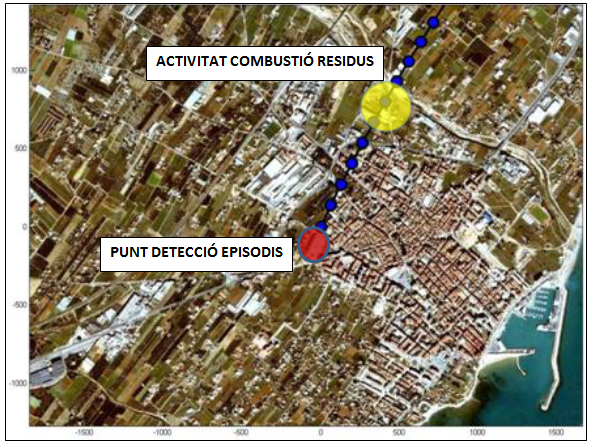 Retrotrajectòria d’episodi de contaminació amb indicació de la font origen |