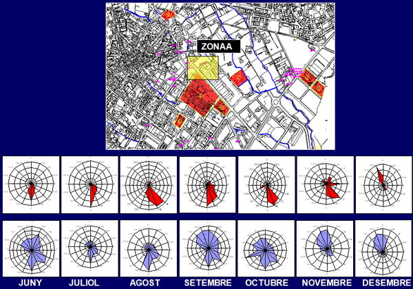El estudio de las condiciones meteorológicas antes, durante y después de la detección del episodio a partir de los datos de registro de formularios de detección horaria permite, siguiendo el procedimento establecido por la norma VDI 3940, asignar las correspondientes direcciones de origen de los episodios con el cálculo de las frecuencias origen (rosas de episodios). La representación de las rosas de episodios en cada uno de los puntos de control, nos permite determinar en un primer nivel los diferentes orígenes coincidentes en fuentes emisoras conocidas y el análisis de la posible existencia de fuentes desconocidas.