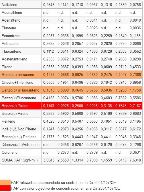 Taula 1. Niveles de concentración de hidrocarburos aromáticos policíclicos en la fase particulada PM10