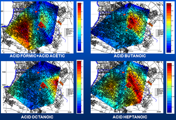 La aplicación del control químico en áreas urbanas mediante un programa de control con la identificación de los compuestos detectados en el aire permite generar los correspondientes mapas de concentración a nivel de compuesto individual y por familias químicas. La distribución de los niveles de concentración de los diferentes contaminantes permite un primer nivel de información de los orígenes de las fuentes emisoras como podemos observar en la figura 2.